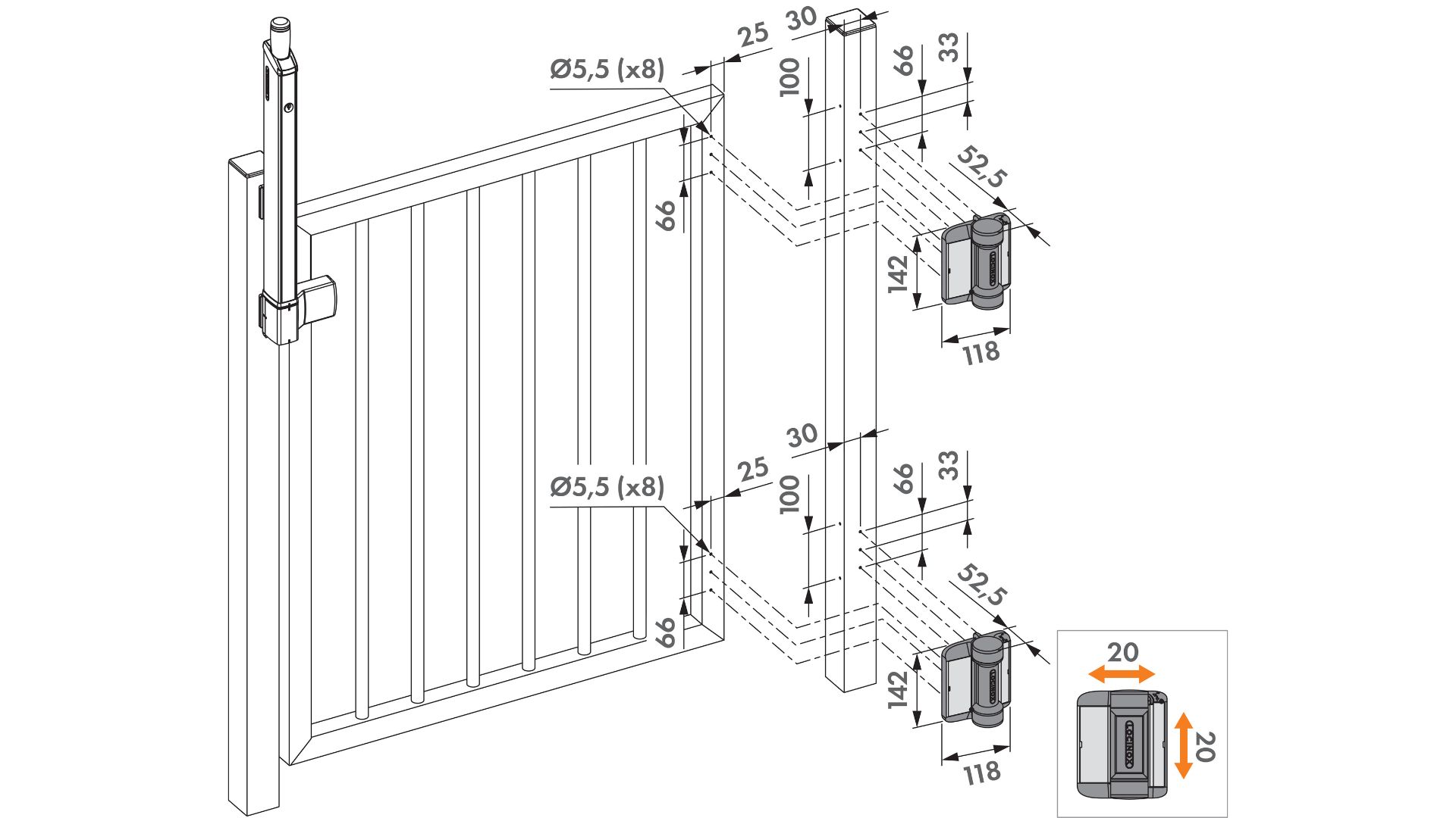 Vertikalna i horizontalna podesivost od 20 mm omogućuje jednostavnu i fleksibilnu ugradnju. Šarka se čvrsto pričvršćuje samobušećim vijcima – bez potrebe za zavarivanjem. Pogodna je za ugradnju na kvadratne i okrugle okvire.